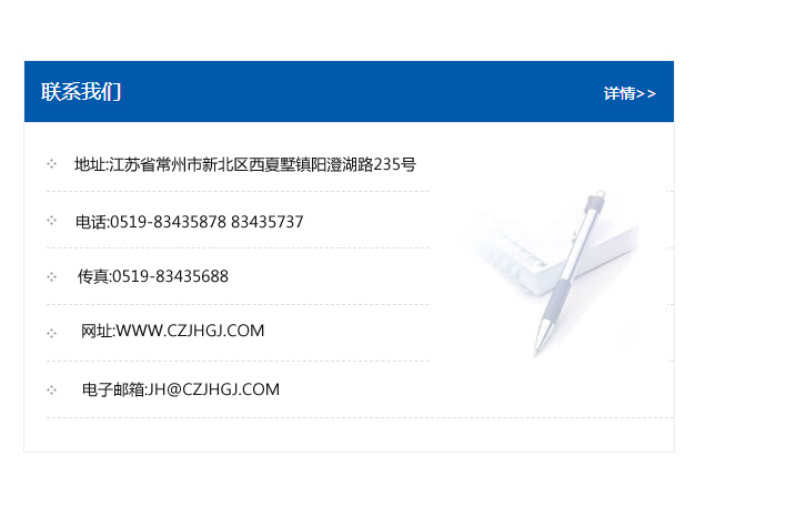 傳真:0519-83435688    郵編:213135    網址:WWW.czjhgj_com.hyspbz.com    電子郵箱:JH@czjhgj_com.hyspbz.com